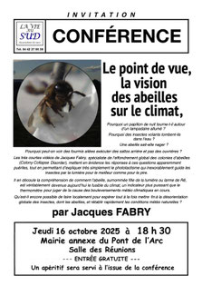 "La Vie au Sud" reprend ses conférences mensuelles d'octobre 2025 à avril 2026, chaque 3e jeudi à 18h30 à la Mairie du Pont de l'Arc. Un apéritif suivra chaque séance.